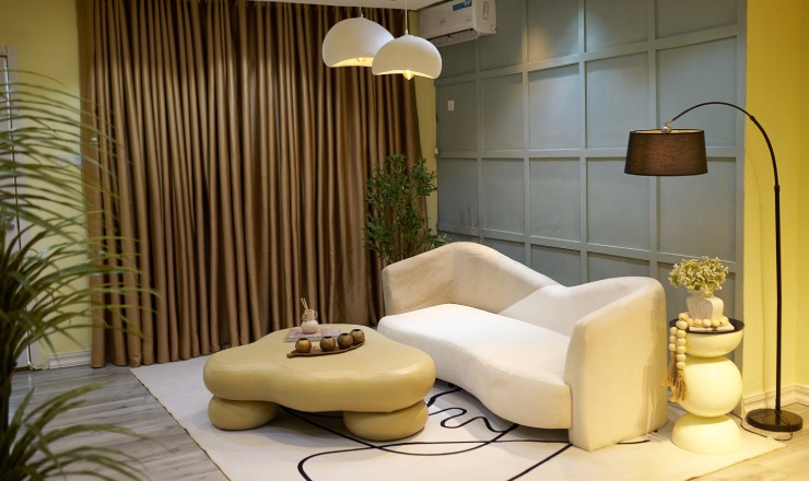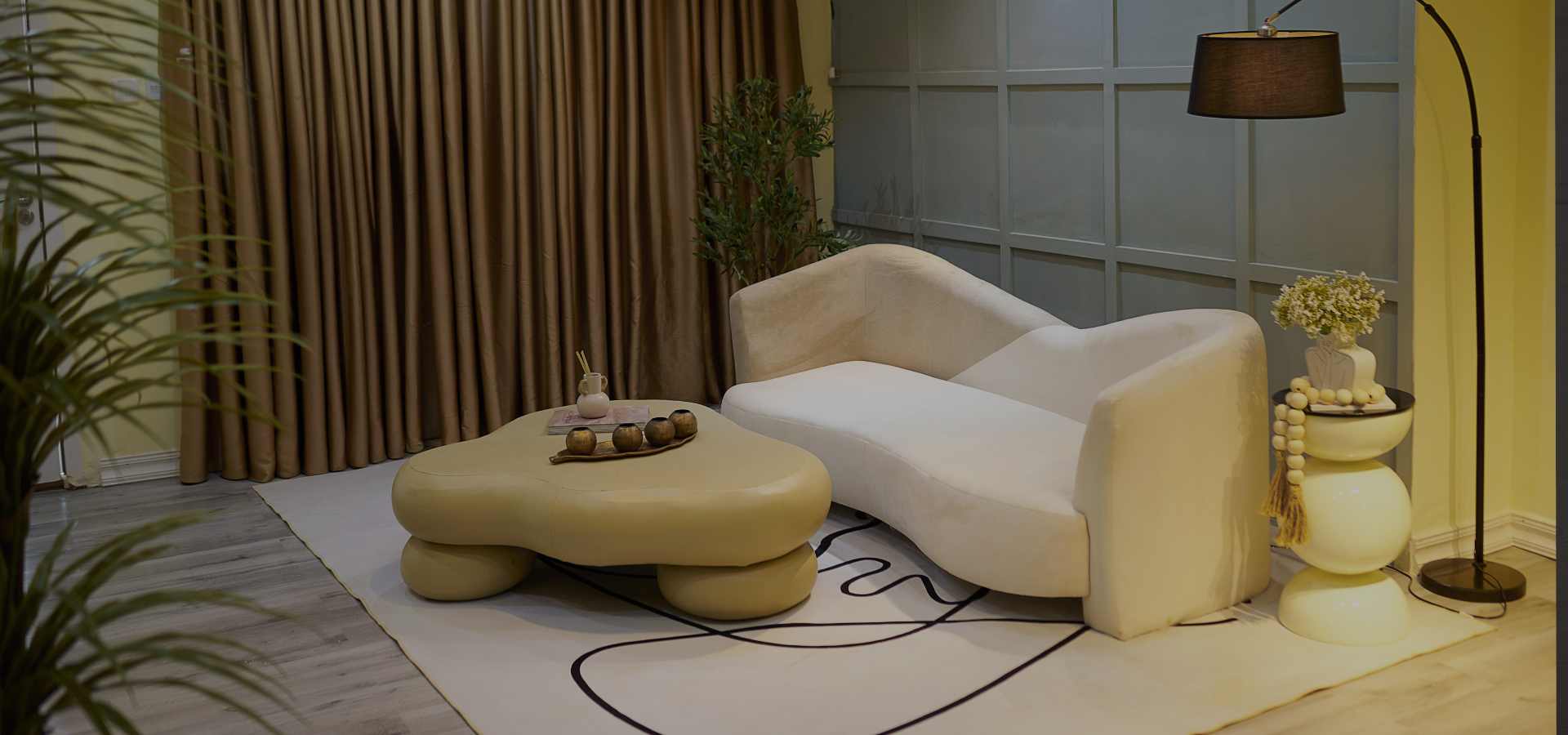 - Styled with a fiber rug, floor lamp, and earth-tone props