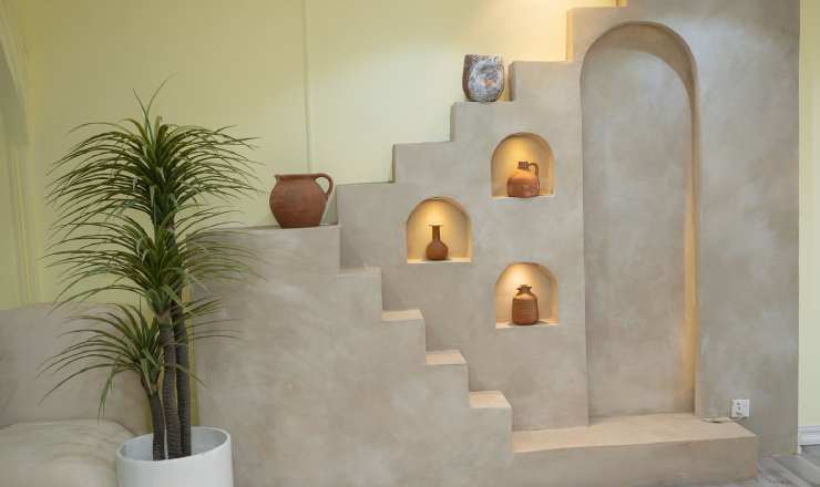 - Elevated limewash-textured staircase